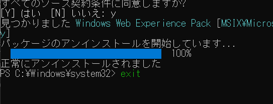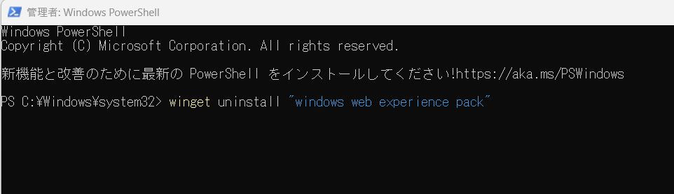 ・「winget uninstall "windows web experience pack"」と入力してエンターキー